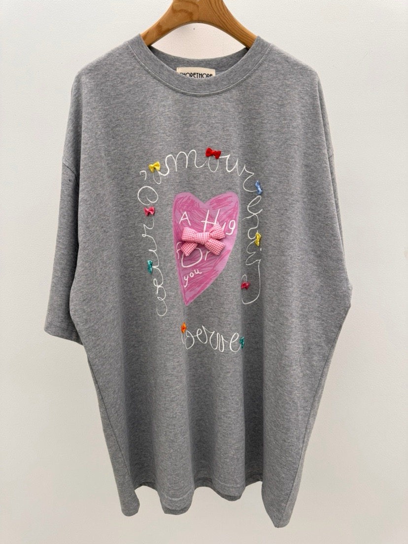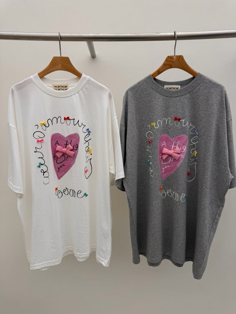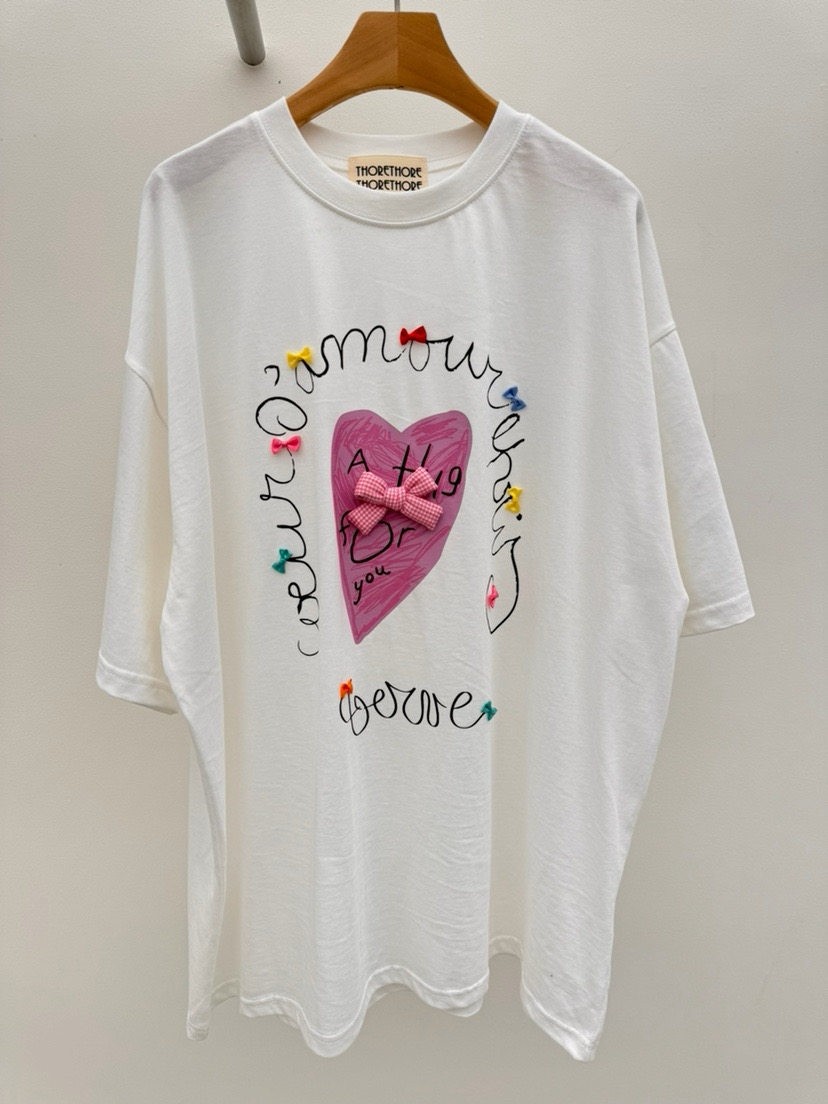 韩国女装 Thore爱心印花蝴蝶结甜美短袖 T恤